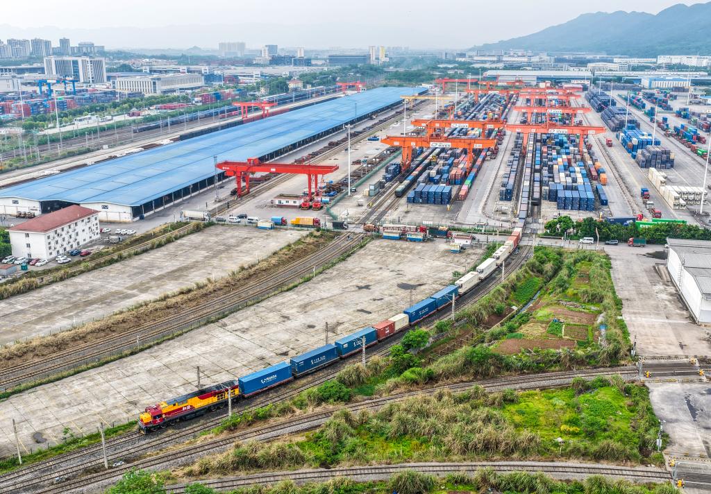 15日、重慶製新エネ車を満載し、団結村中心駅を出発した「中老鉄道」の国際貨物列車。(ドローンから、重慶=新華社記者/唐奕)