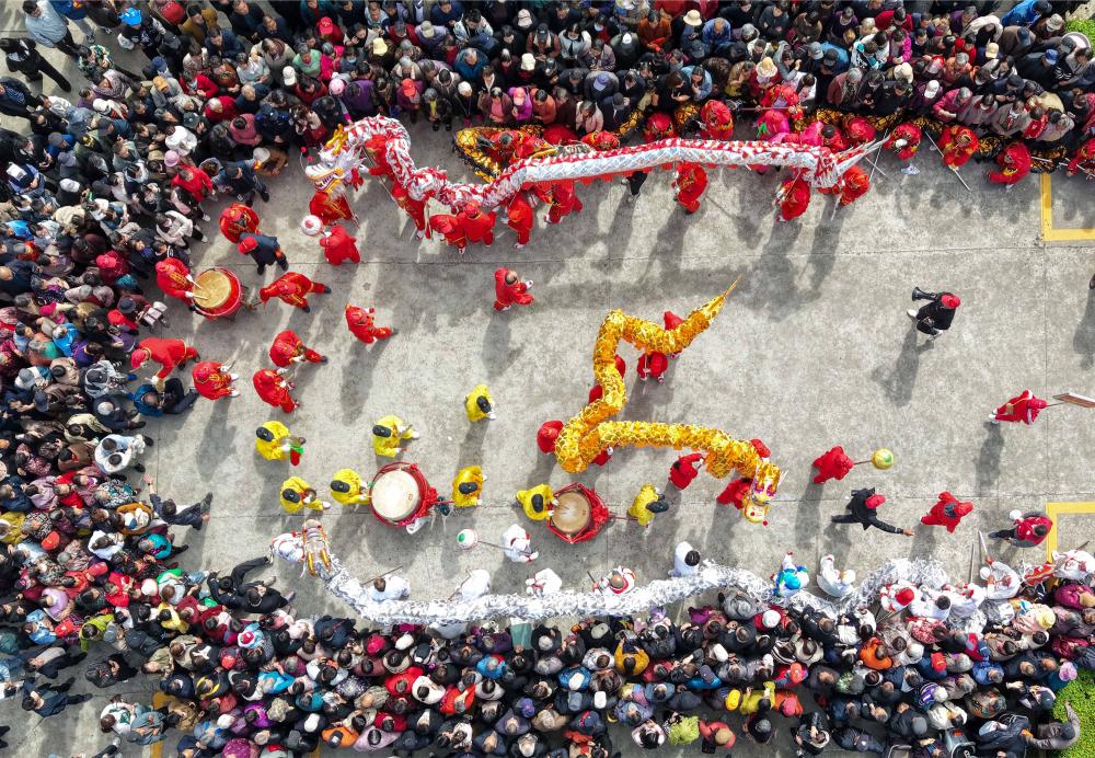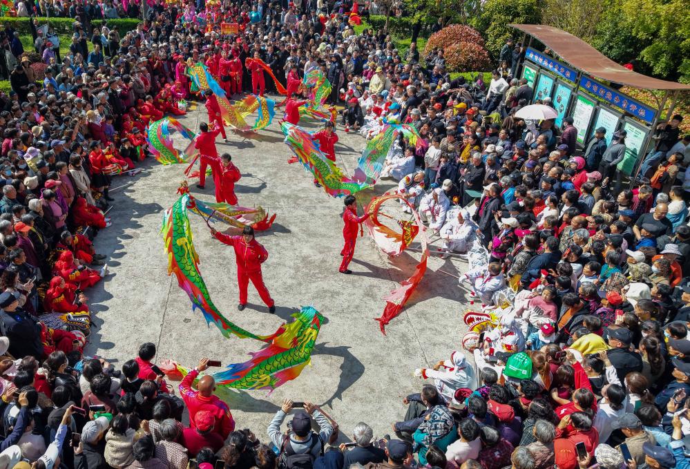 19日、江蘇省泰州市海陵区の「三月三」伝統廟会(びょうえ=縁日)で竜舞を披露する地元住民。(ドローンから、泰州=新華社配信/湯徳宏)