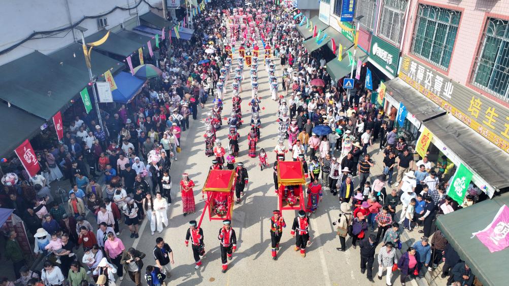 19日、広西チワン族自治区柳州市融安県で、盛装して「三月三」パレードに参加した各民族の人々。(ドローンから、融安=新華社配信/譚克興)