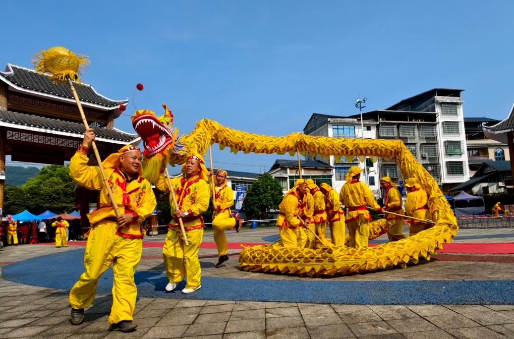 19日、広西チワン族自治区柳州市融安県の広場で開催された「三月三」イベントで竜舞を披露する人たち。(融安=新華社配信/譚克興)