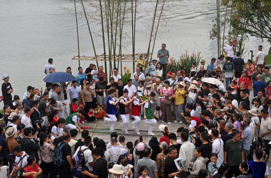 19日、「広西三月三・八桂カーニバル」が開かれた広西チワン族自治区南寧市の民歌湖で、竹竿舞(バンブーダンス)を見物する観光客。(南寧=新華社記者/陸波岸)