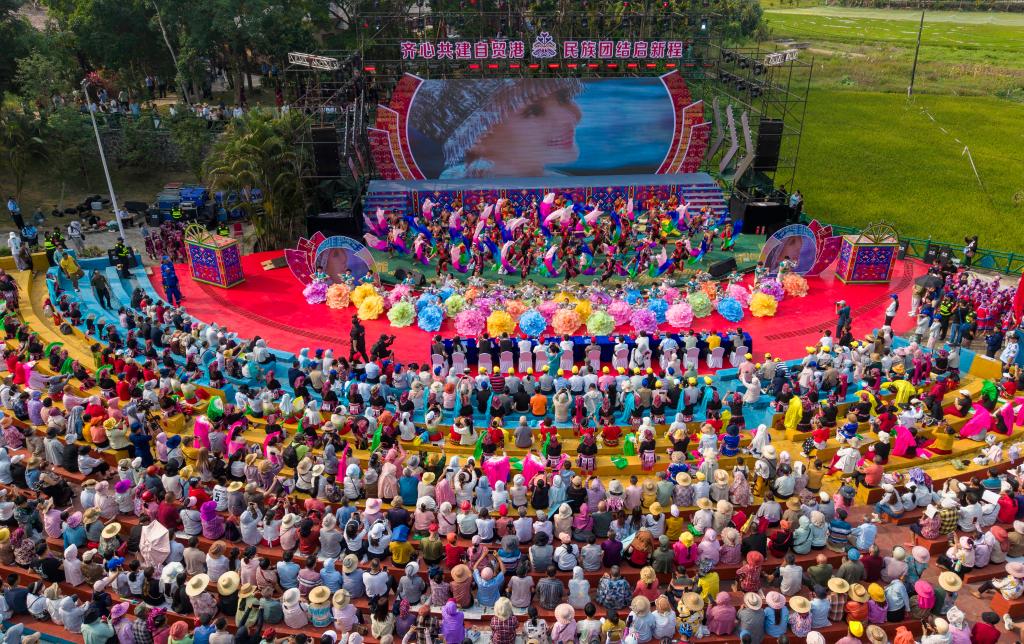 19日、海南省瓊海市会山鎮で行われた「三月三」イベント。(ドローンから、瓊海=新華社配信/蒙鍾徳)