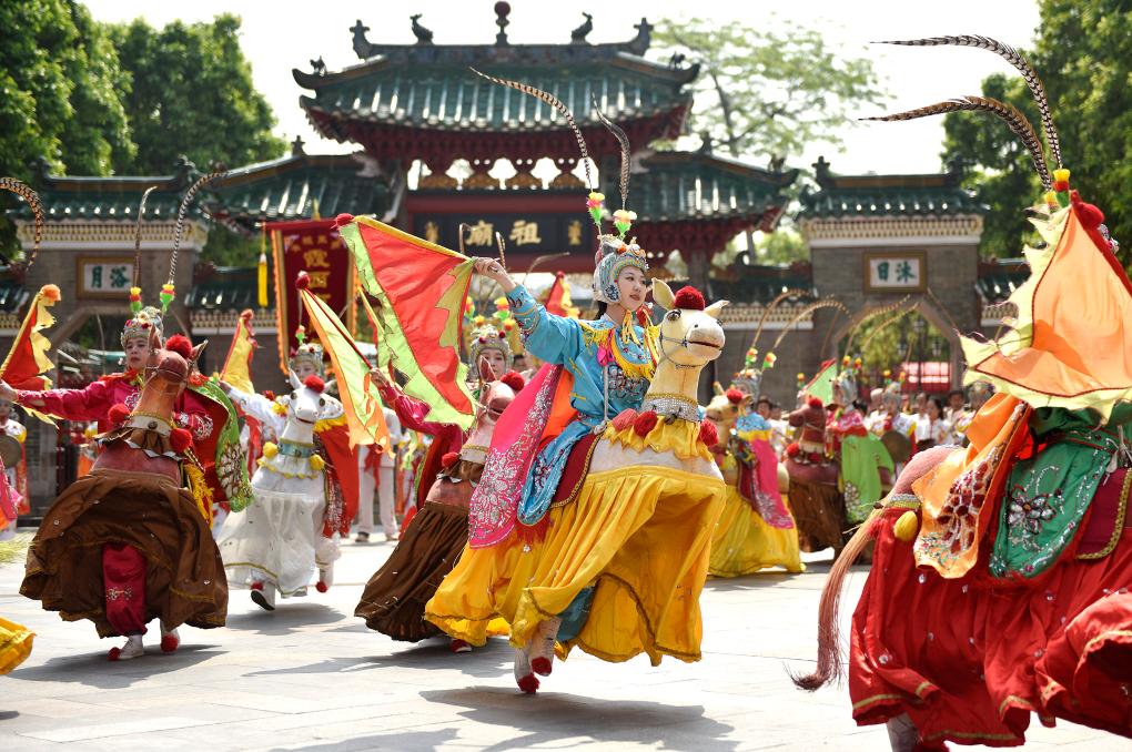 19日、広東省仏山市の伝統行事で披露された民俗舞踊。(仏山=新華社配信/誾洪)