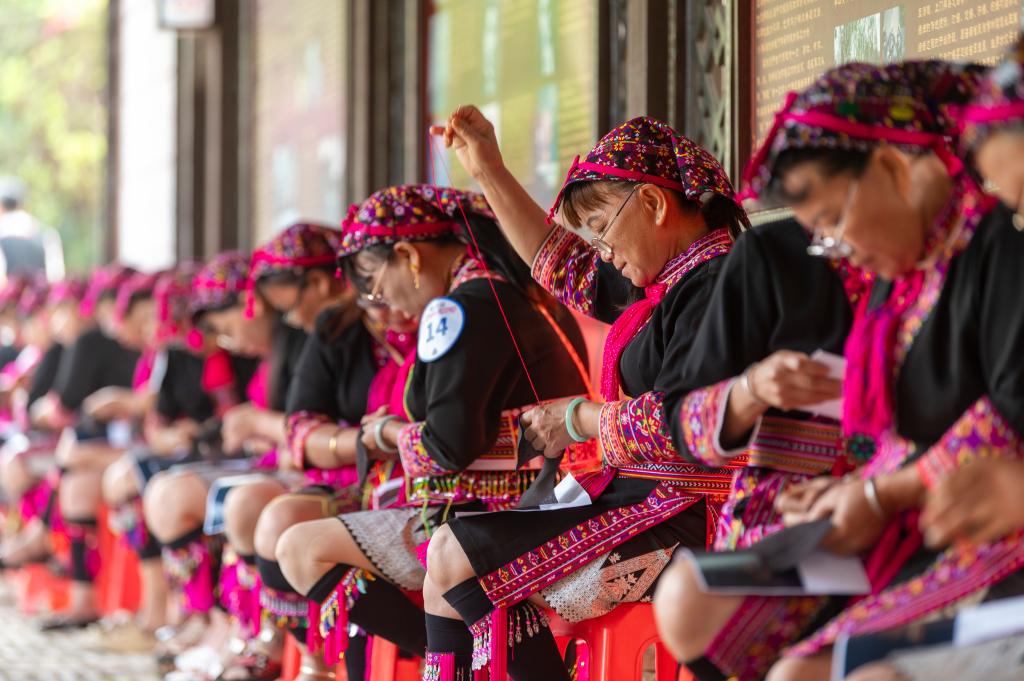 19日、海南省瓊海市会山鎮の「三月三」イベントで、伝統的な刺しゅうのコンテストに参加したミャオ族の女性たち。(瓊海=新華社配信/蒙鍾徳)