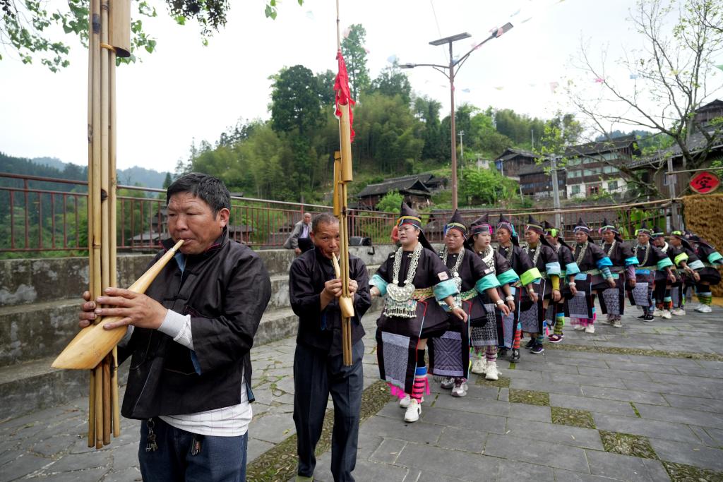 19日、貴州省黔東南(けんとうなん)ミャオ族トン族自治州榕江県の空申苗寨(ミャオ族集落)で、蘆笙舞(ろしょうまい)を踊り「三月三」を祝う人々。(榕江=新華社配信/王炳真)