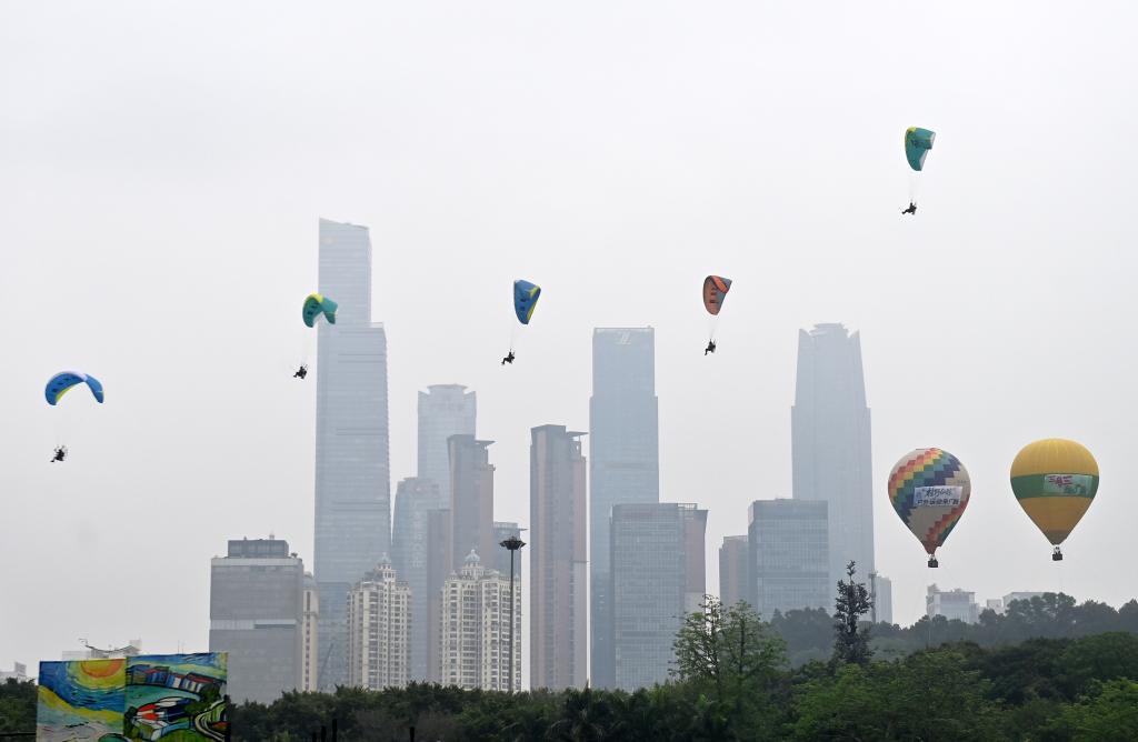 19日、「広西三月三・八桂カーニバル」が開かれた広西チワン族自治区南寧市の民歌湖で編隊飛行を披露するパラグライダー。(南寧=新華社記者/陸波岸)