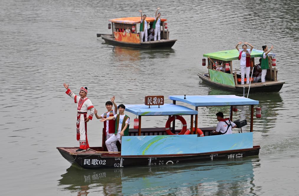 19日、「広西三月三・八桂カーニバル」が開かれた広西チワン族自治区南寧市の民歌湖で遊覧ボートに乗りパフォーマンスを披露する出演者。(南寧=新華社記者/陸波岸)