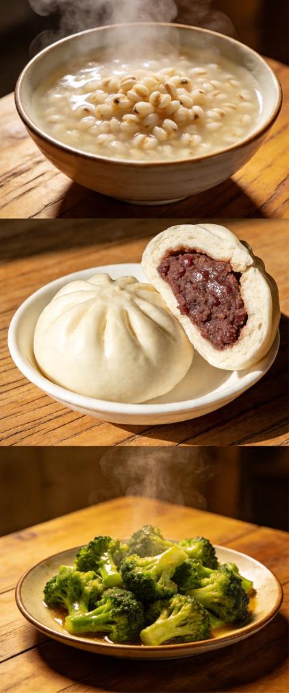 穀雨の時期にお薦めの料理。上からハトムギ粥、あんまん、ブロッコリーの炒め物。(北京=新華社配信)
