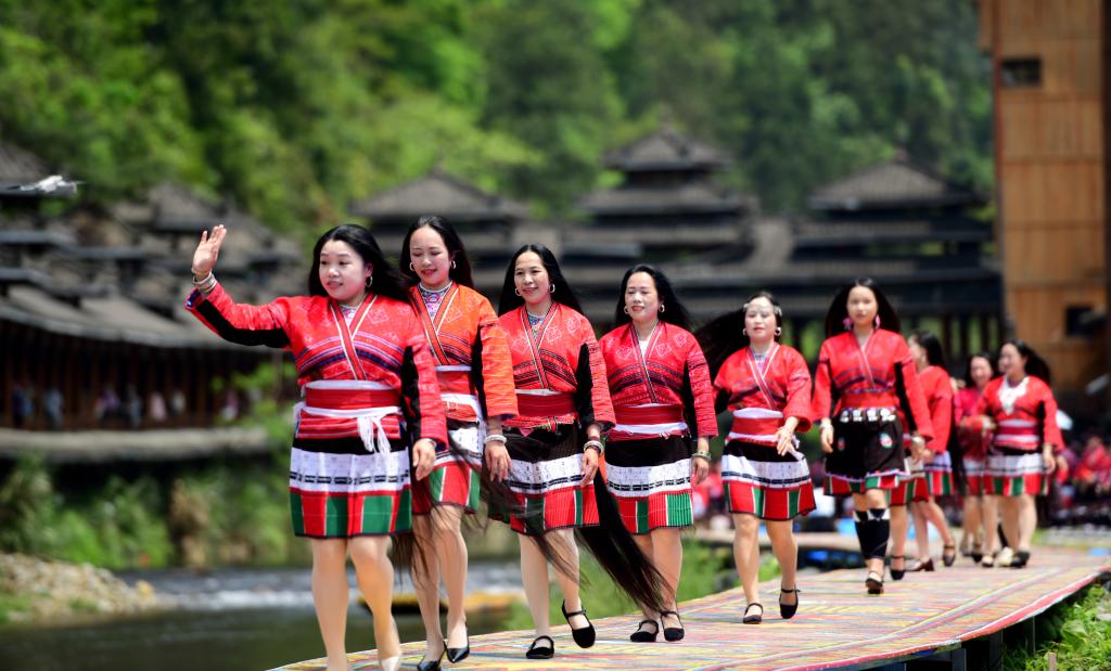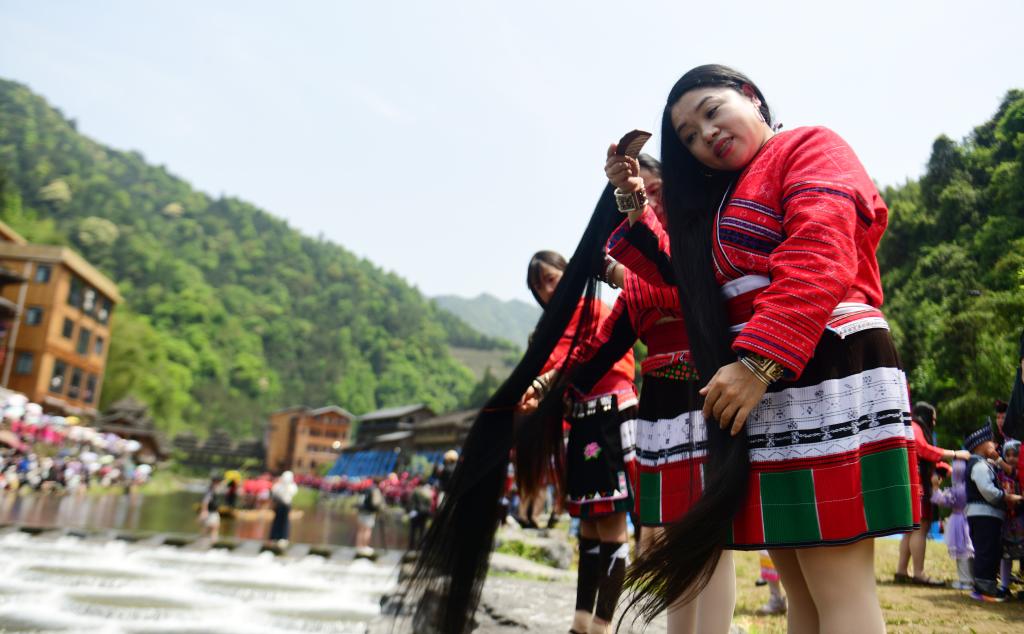 【新華社桂林4月21日】中国広西チワン族自治区桂林市竜勝各族自治県金江村で19日、紅ヤオ族(ヤオ族の支族)による年に一度の「長髪祭り」が開催された。人々は整髪の実演やファッションショー、民謡の掛け合い、踊りなどを楽しみ、旧暦3月3日の伝統的な祝日「三月三」を過ごした。