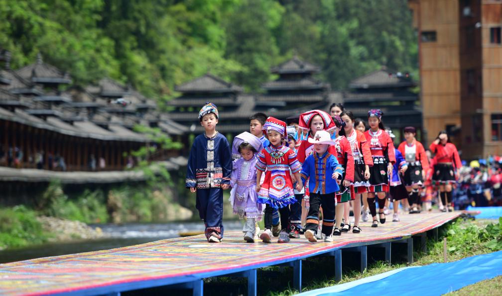 19日、桂林市竜勝各族自治県金江村でファッションショーに参加した民族衣装姿の子ども。(竜勝=新華社配信/潘志祥)