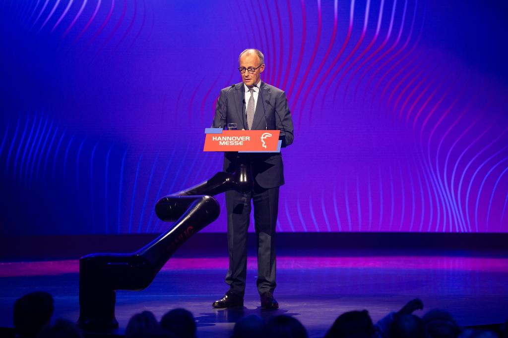 19日、ハノーバーメッセの開幕式であいさつするドイツのメルツ首相。(ハノーバー=新華社記者/張豪夫)