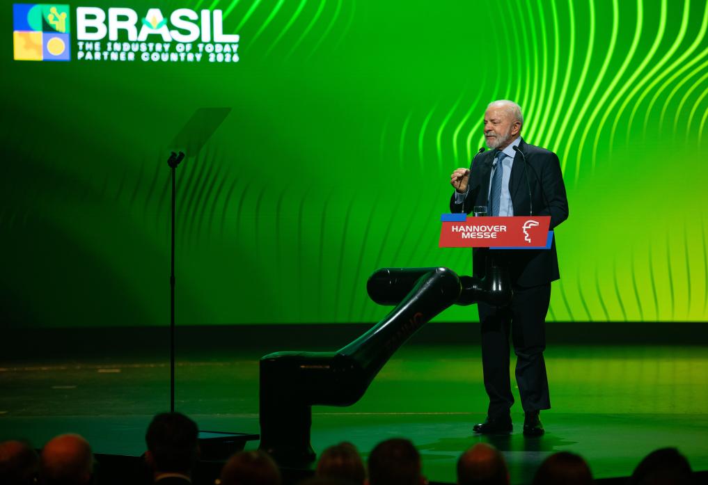 19日、ハノーバーメッセの開幕式であいさつする主賓国ブラジルのルラ大統領。(ハノーバー=新華社記者/張豪夫)