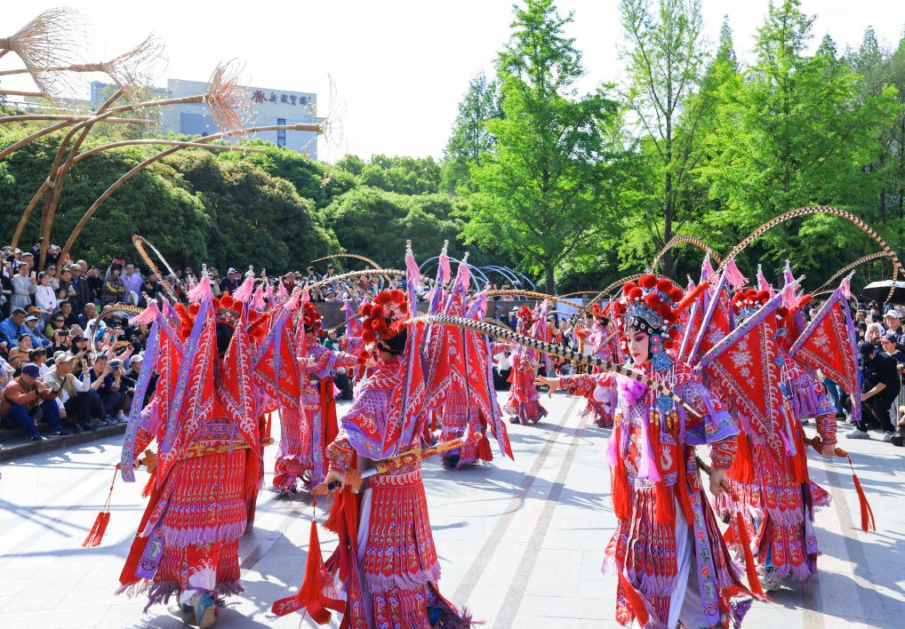 18日、古城公園で披露された浙江省の地方劇、婺劇(ぶげき)。(上海=新華社記者/劉穎)
