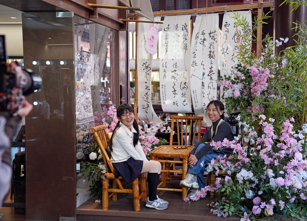 18日、豫園商城でカメラに向かってポーズを取る観光客。(上海=新華社記者/劉穎)