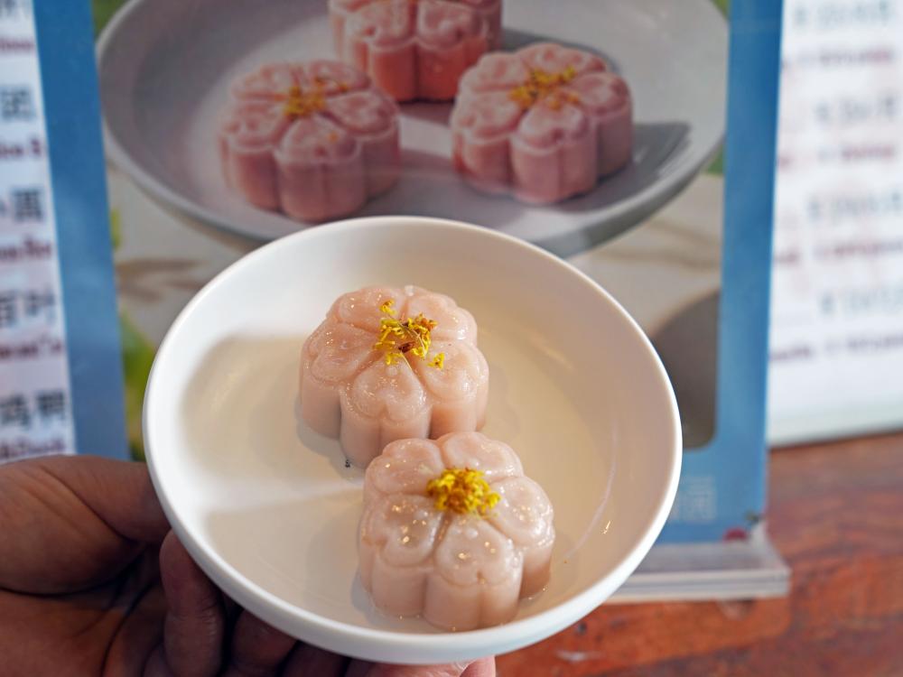 18日、豫園商城の老舗「寧波湯団店」で提供された桃の花をかたどった季節限定の蒸し菓子。(上海=新華社記者/劉穎)