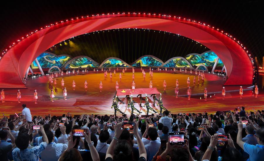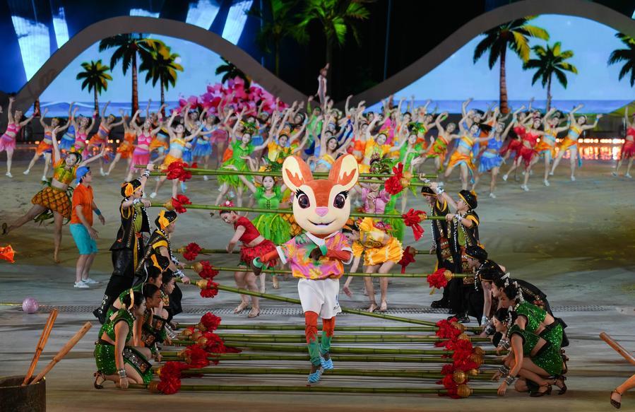 22日、第6回アジアビーチゲームズ開会式のパフォーマンス。(三亜=新華社記者/潘昱竜)