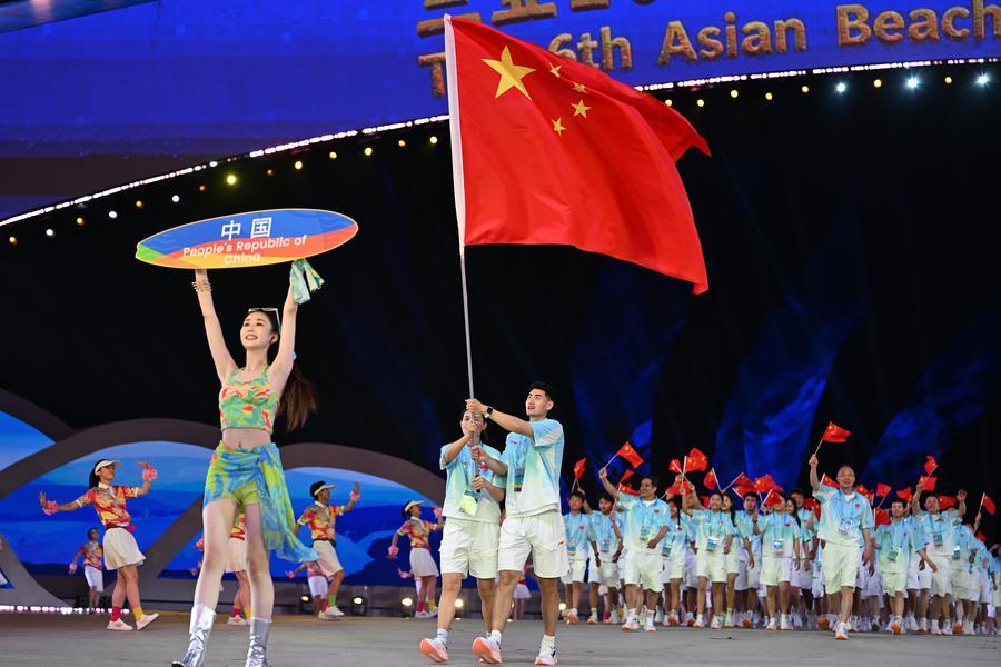 22日、第6回アジアビーチゲームズの開会式で入場する中国選手団。(三亜=新華社記者/趙子碩)