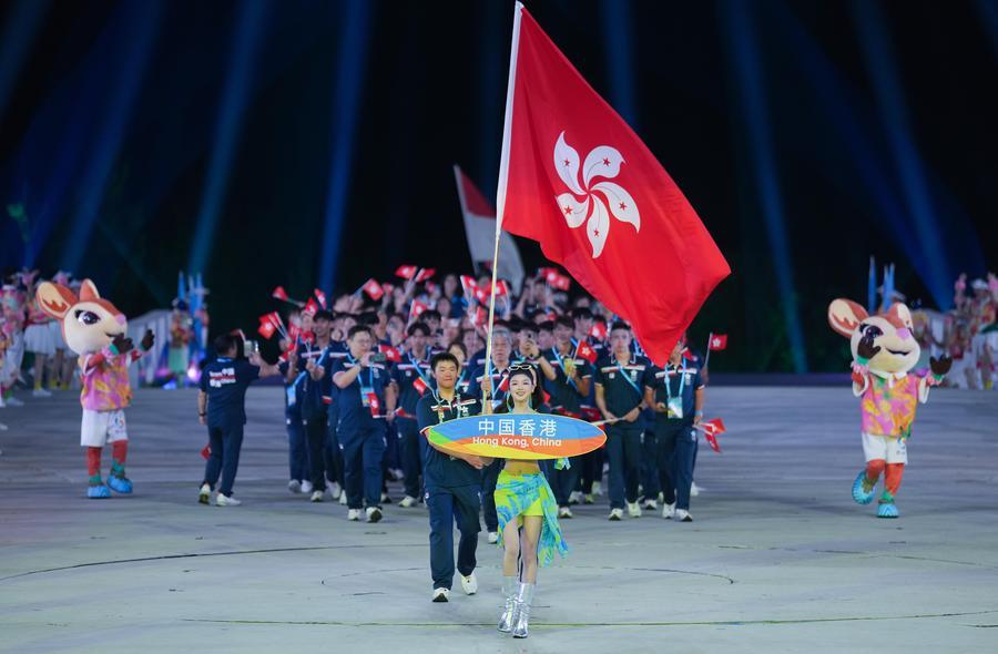 22日、第6回アジアビーチゲームズの開会式で入場する中国香港選手団。(三亜=新華社記者/李尕)