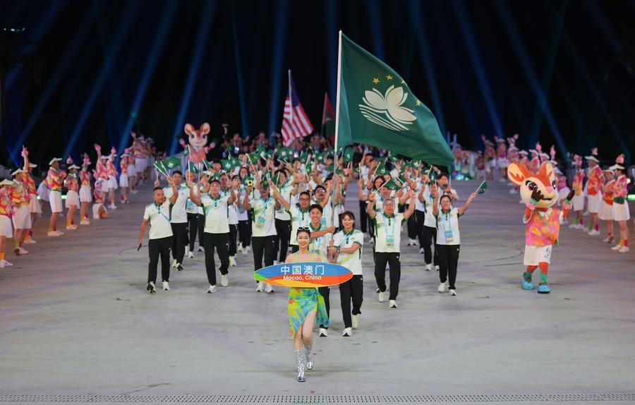 22日、第6回アジアビーチゲームズの開会式で入場する中国マカオ選手団。(三亜=新華社記者/李尕)