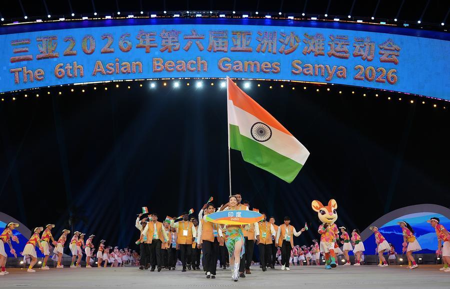 22日、第6回アジアビーチゲームズの開会式で入場するインド選手団。(三亜=新華社記者/潘昱竜)