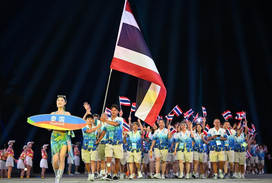 22日、第6回アジアビーチゲームズの開会式で入場するタイ選手団。(三亜=新華社記者/趙子碩)