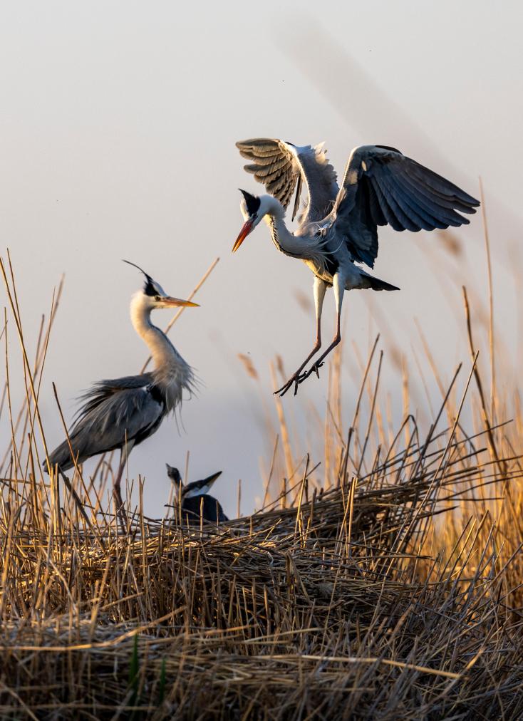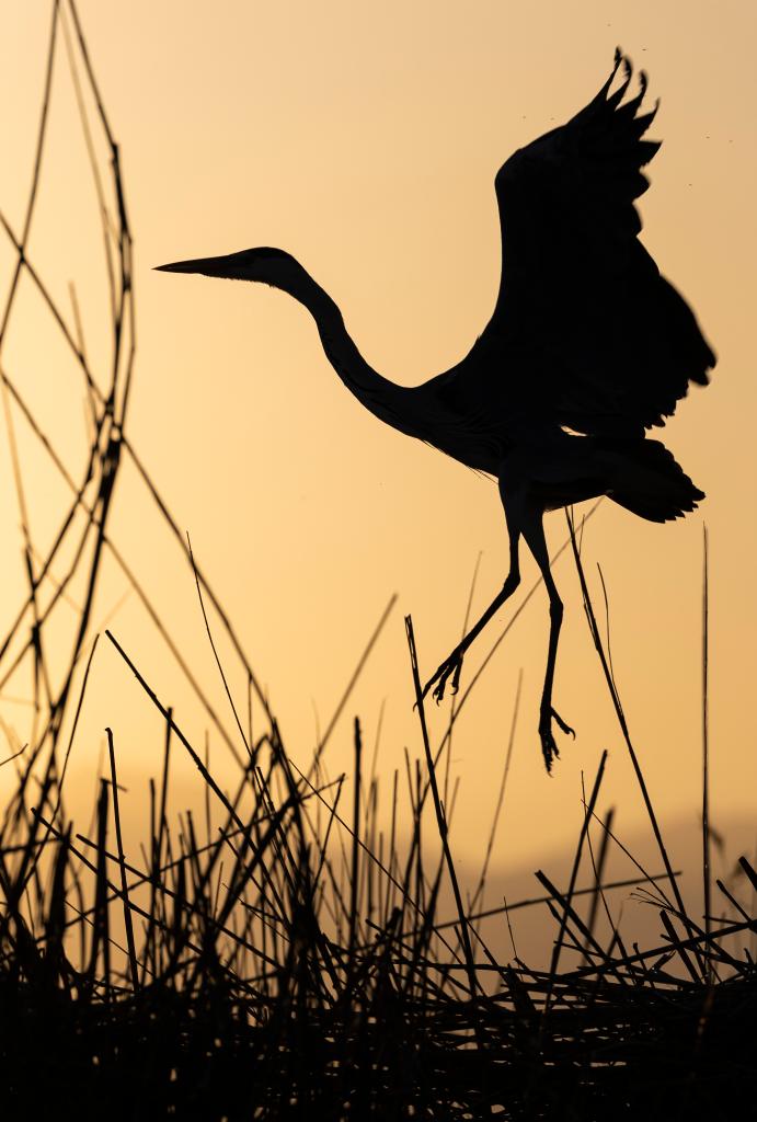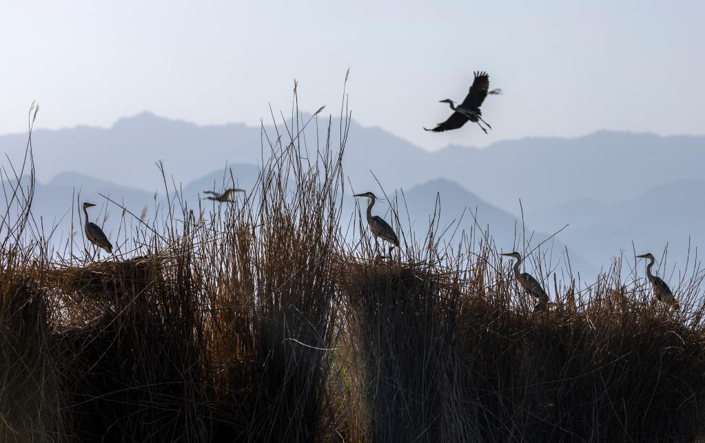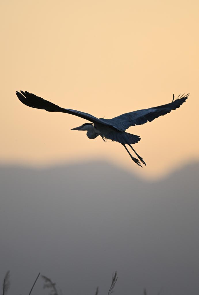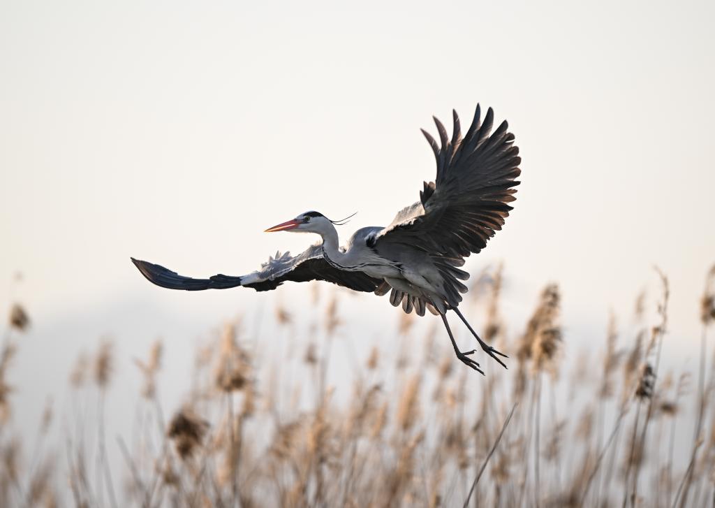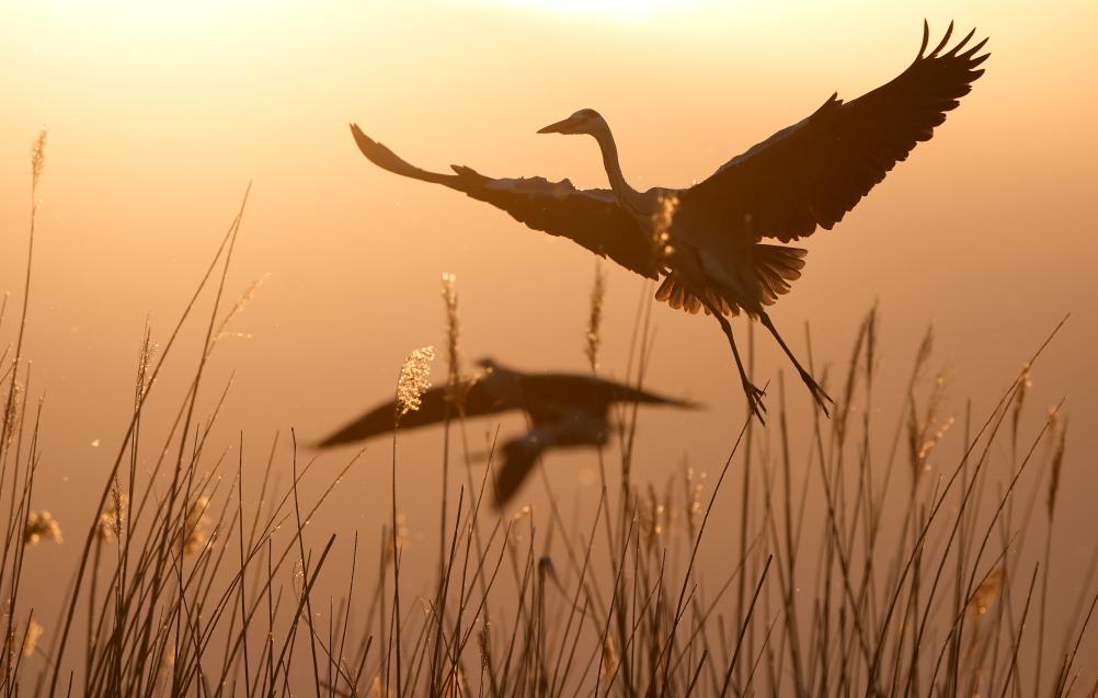 17日、沙湖風景区のヨシ原で舞い上がるアオサギ。(銀川=新華社記者/馮開華)
