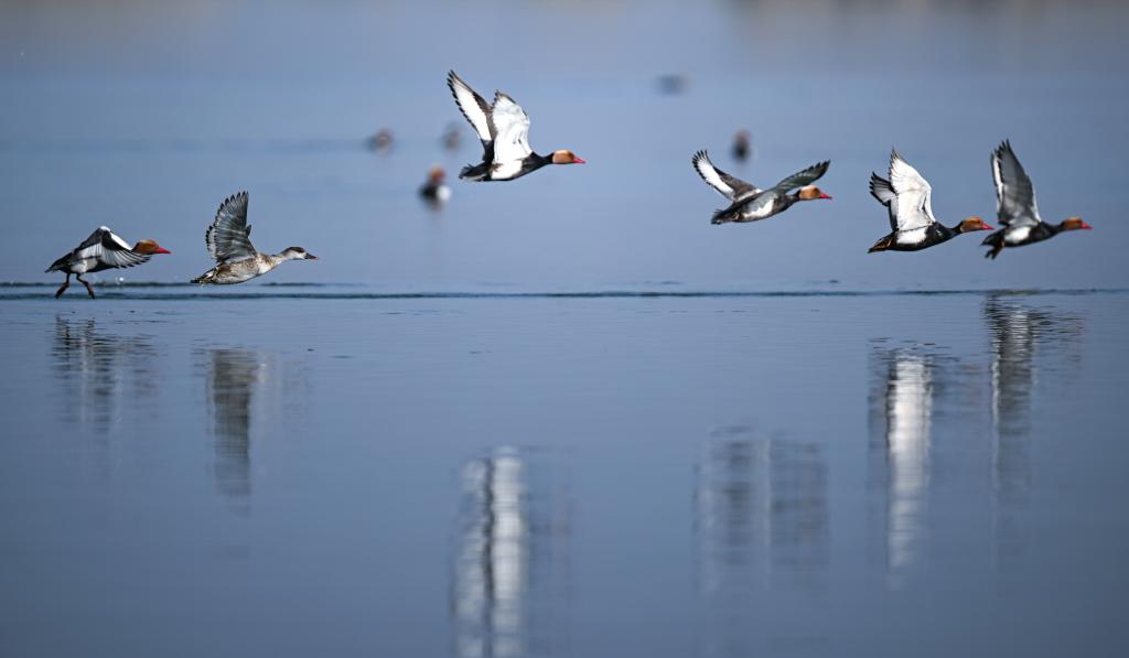 18日、沙湖の水面を飛ぶアカハシハジロ。(銀川=新華社記者/馮開華)