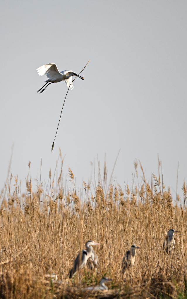 17日、ヨシをくわえて飛ぶヘラサギ。(銀川=新華社記者/馮開華)