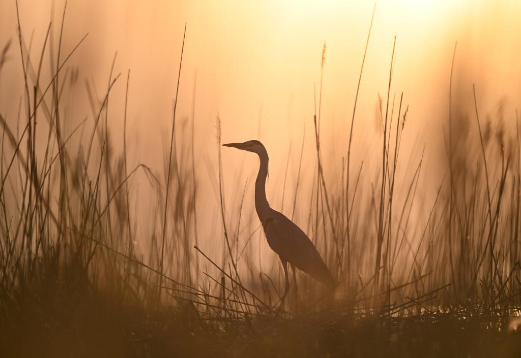 18日、沙湖風景区のヨシ原で羽を休めるアオサギ。(銀川=新華社記者/王鵬)