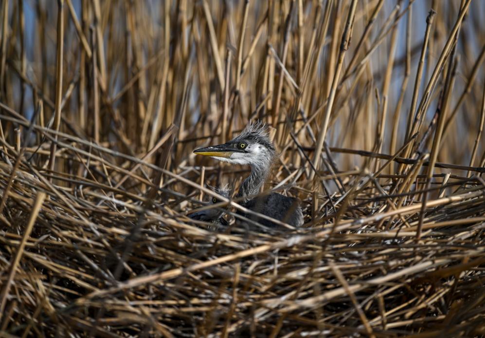 18日、沙湖風景区で撮影したアオサギのひな。(銀川=新華社記者/王鵬)