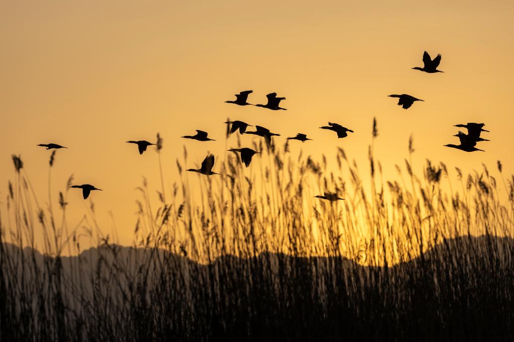 17日、沙湖風景区のヨシ原を飛ぶカワウ。(銀川=新華社記者/王鵬)