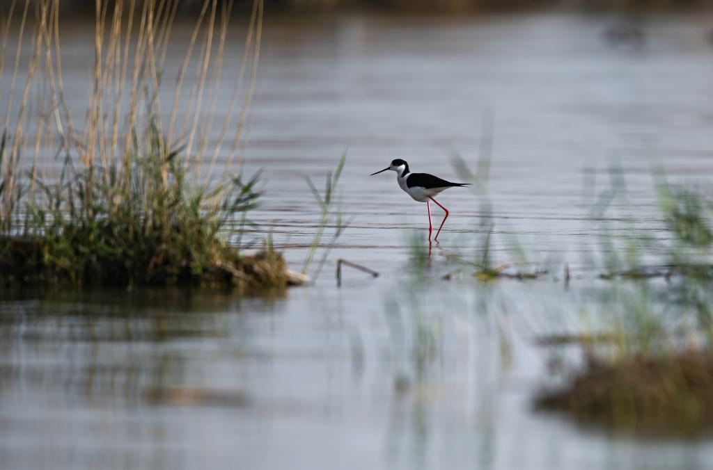 18日、沙湖で餌を探すセイタカシギ。(銀川=新華社記者/馮開華)