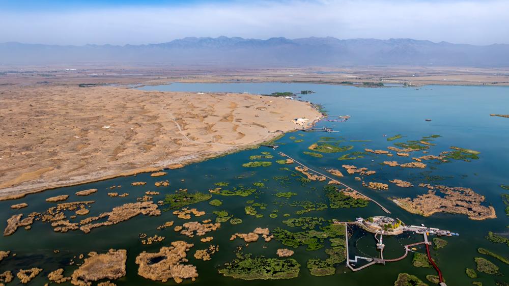 18日、沙湖風景区の景観。(ドローンから、銀川=新華社記者/王鵬)