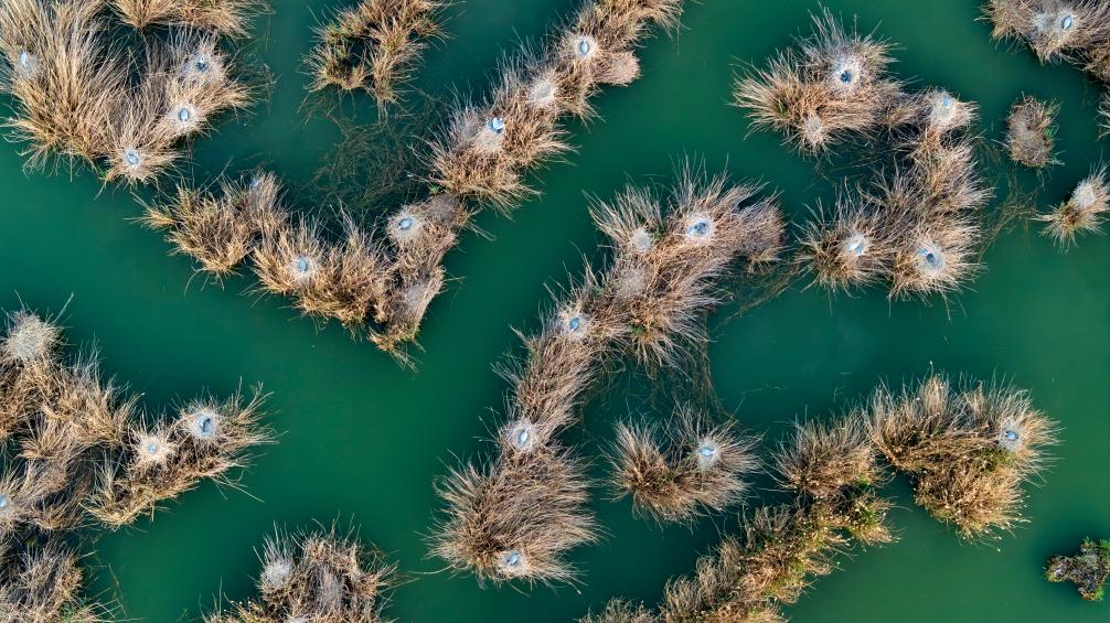 18日、沙湖風景区で撮影したアオサギの巣。(ドローンから、銀川=新華社記者/王鵬)