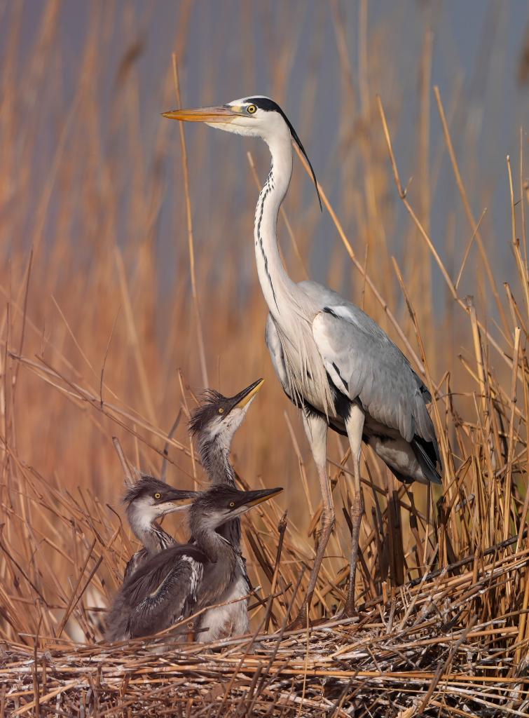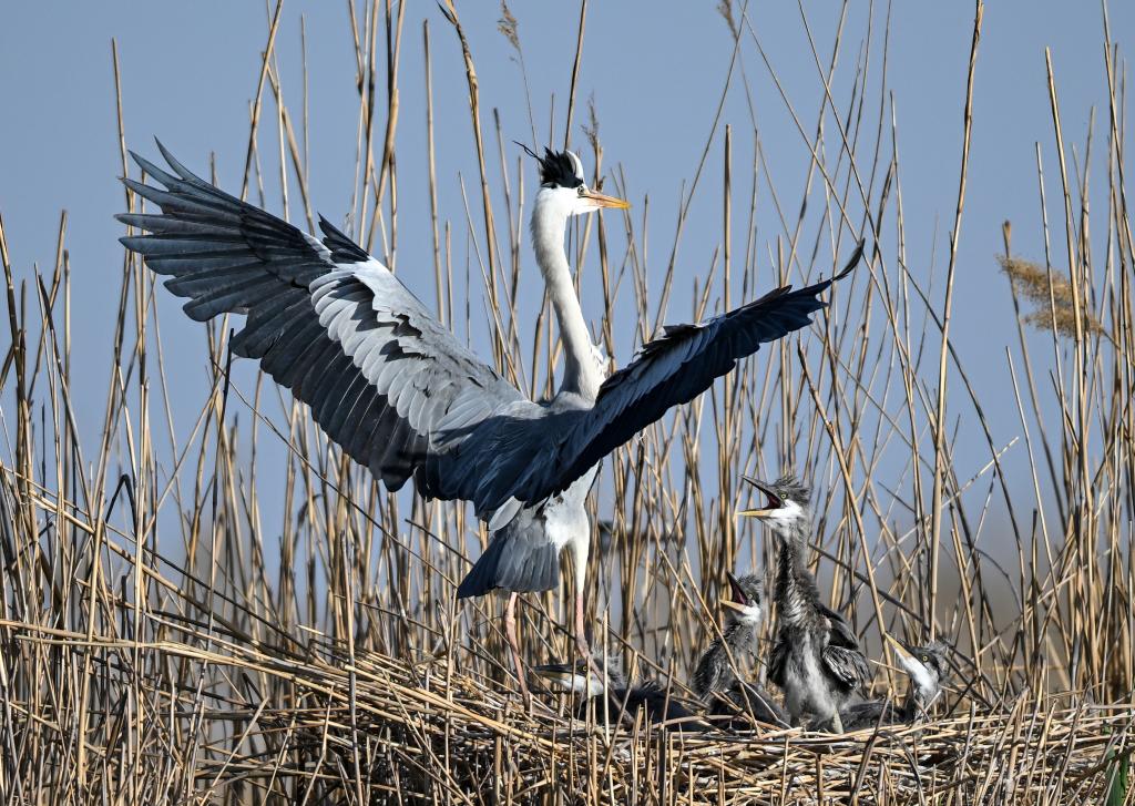 18日、沙湖風景区で撮影したアオサギのひな。(銀川=新華社記者/馮開華)