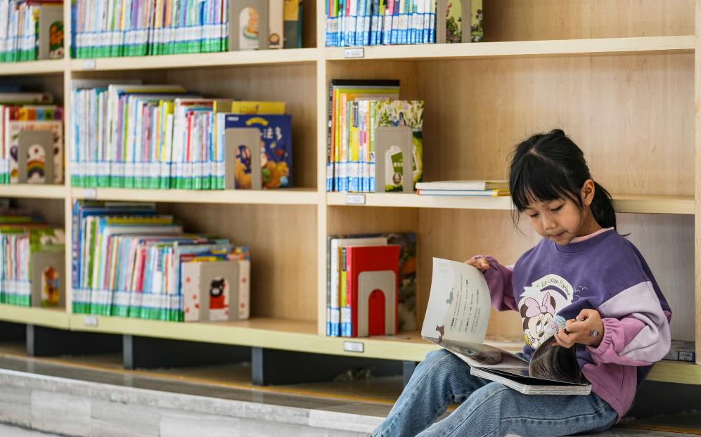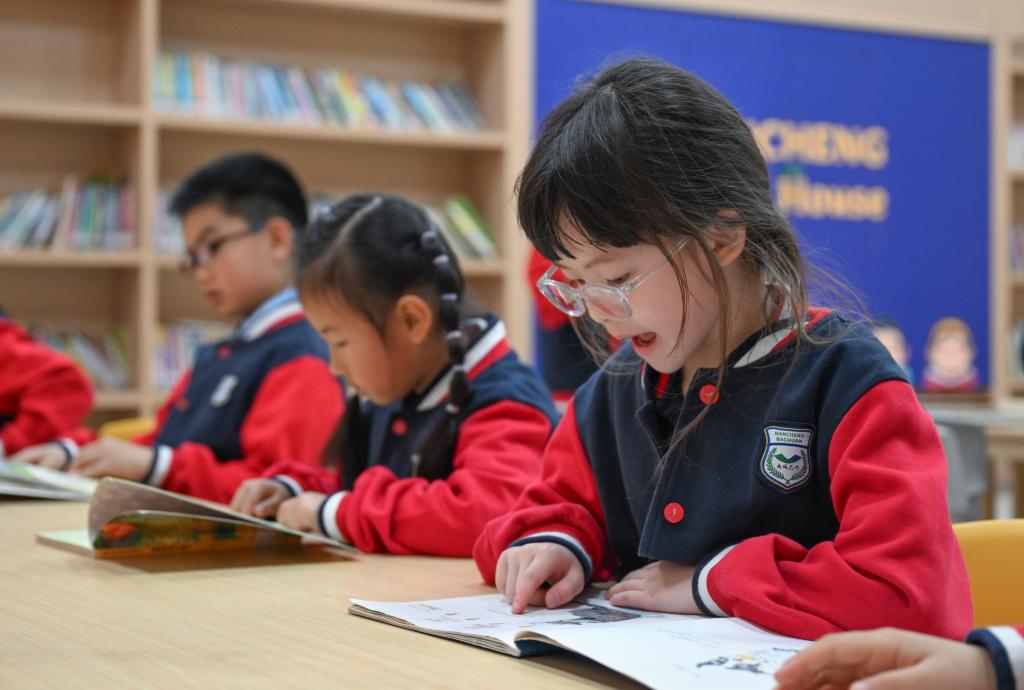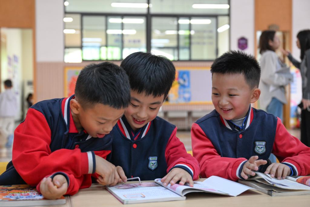 23日、重慶市の南城巴川学校で休み時間に本を読む子どもたち。(重慶=新華社記者/陳誠)