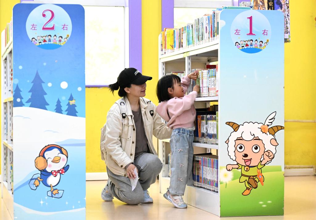 23日、河北省石家荘市の図書館で本を選ぶ親子。(石家荘=新華社配信/陳其保)