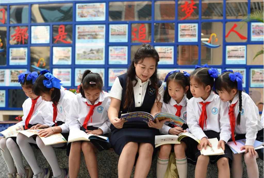 23日、広西チワン族自治区南寧市の浜湖路小学校で本を読む教員と児童。(南寧=新華社記者/陸波岸)