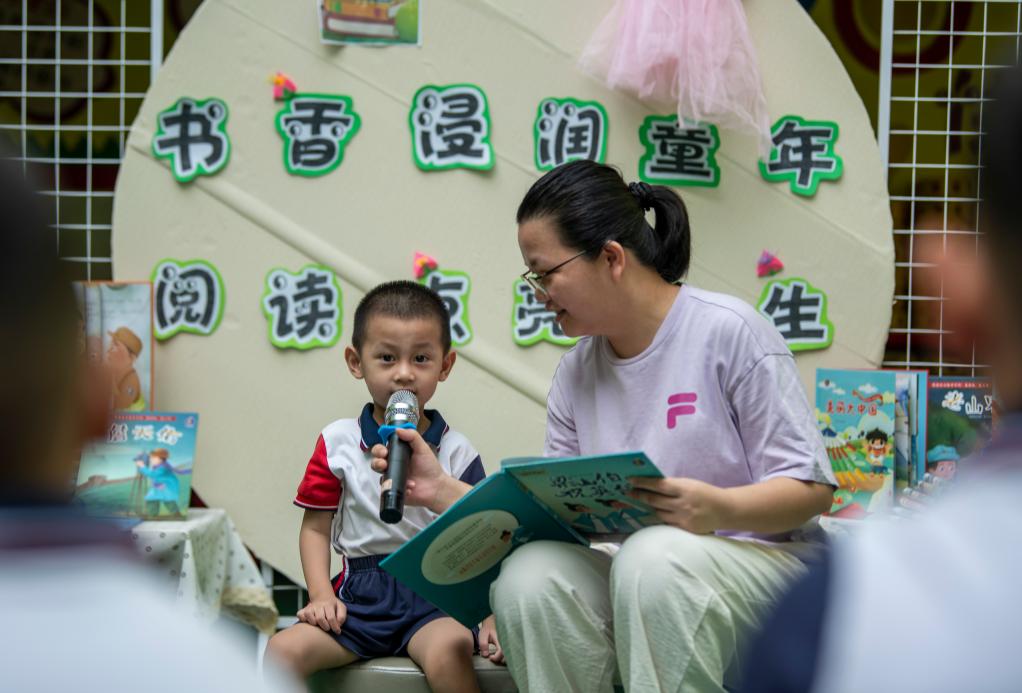 23日、海南省瓊海(けいかい)市の中興幼稚園で読書イベントに参加した親子。(瓊海=新華社配信/蒙鍾徳)