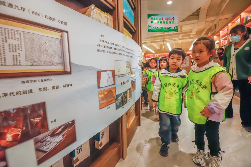 23日、河北省遵化市の新華書店で展示を見る子どもたち。(遵化=新華社配信/劉満倉)
