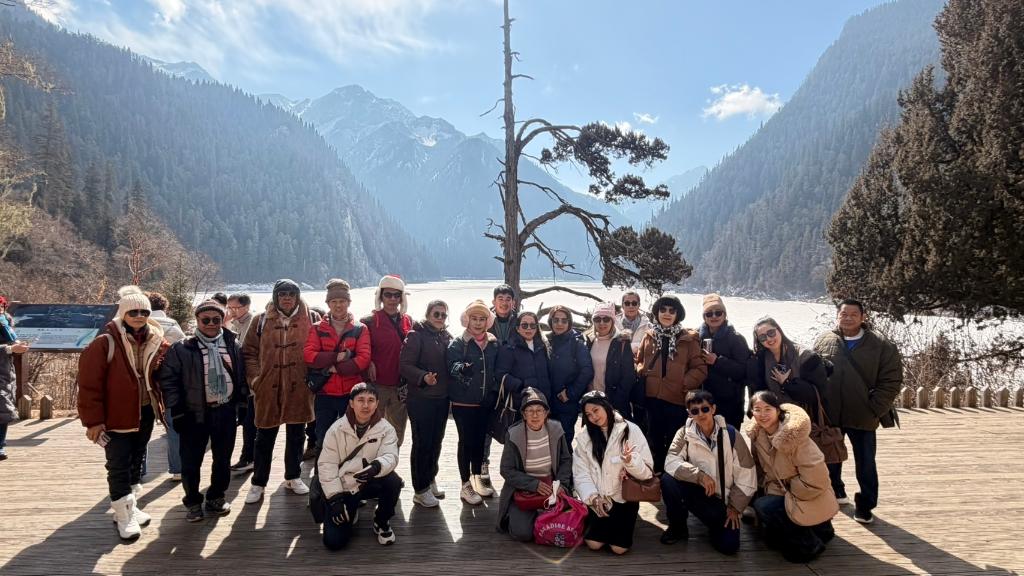四川省の九寨溝風景区で記念撮影するタイ人観光客。(4月8日撮影、アバ=新華社配信/字成秀)