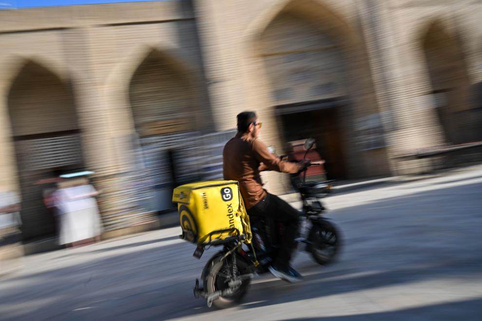 24日、ブハラの街をバイクに乗って出前を届ける配達員。(ブハラ=新華社記者/李任滋)