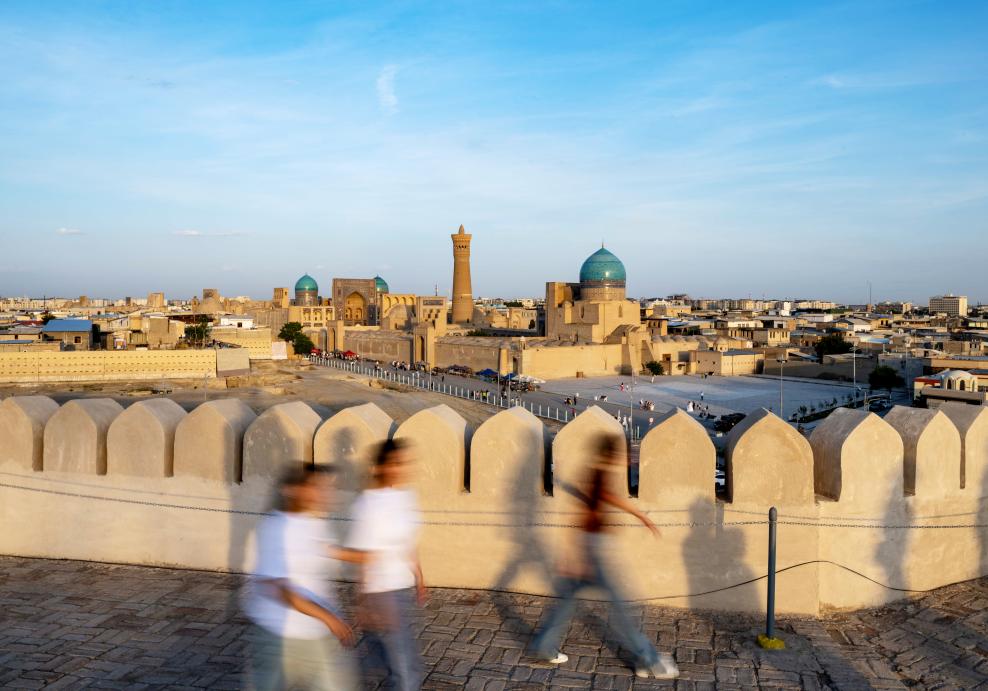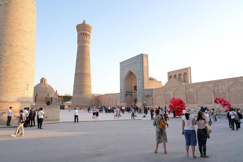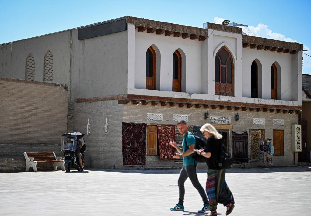 24日、ブハラの街を散策する観光客。(ブハラ=新華社記者/李任滋)