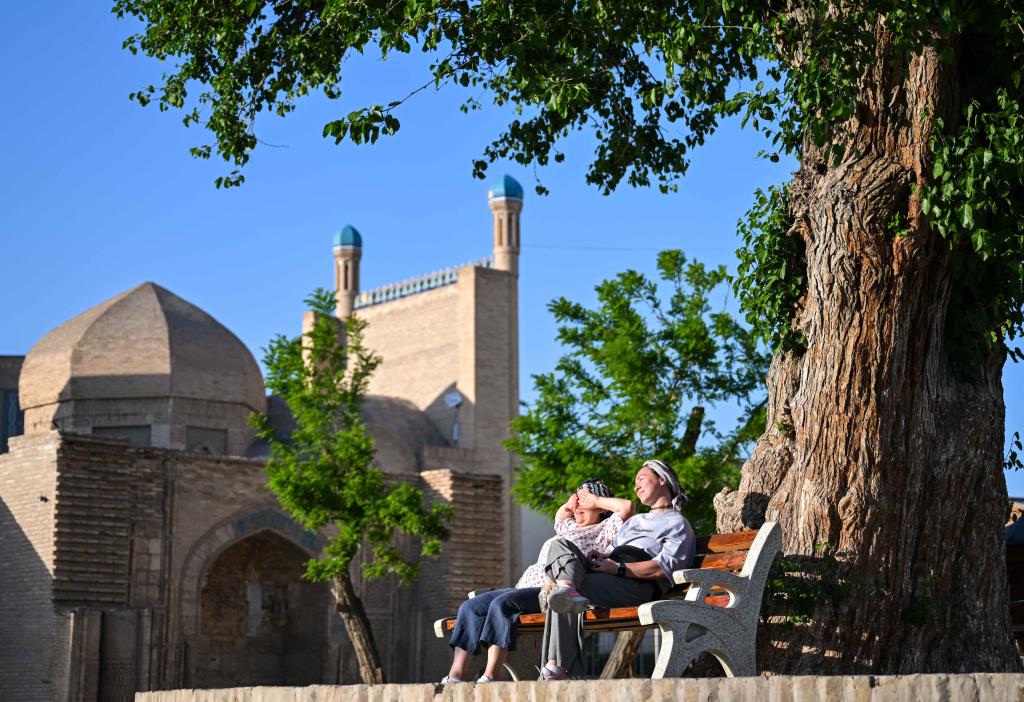 24日、ブハラの街の一角で日差しを浴びる人々。(ブハラ=新華社記者/李任滋)
