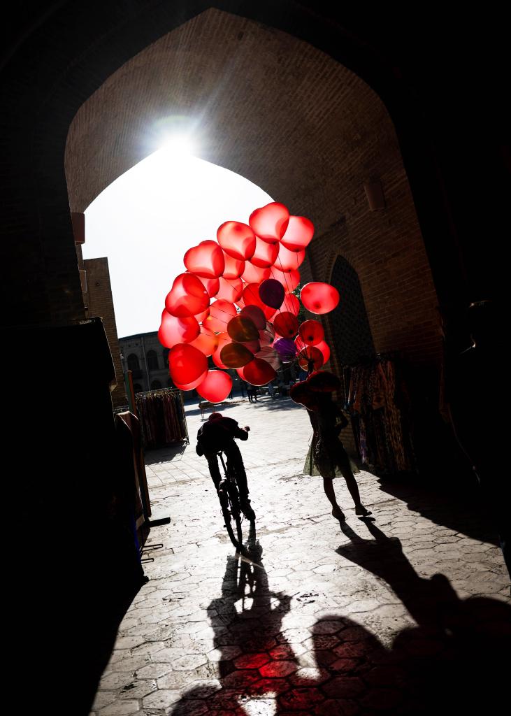24日、ブハラの街で風船を売り歩く女性。(ブハラ=新華社記者/李任滋)