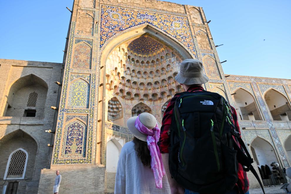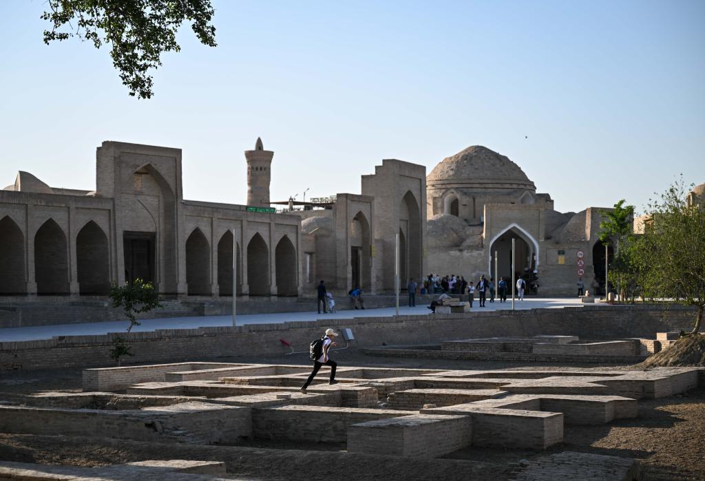 24日、ブハラの街を散策する観光客。(ブハラ=新華社配信)