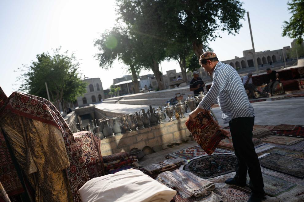 24日、ブハラの街で手作りじゅうたんを整える業者。(ブハラ=新華社記者/李任滋)