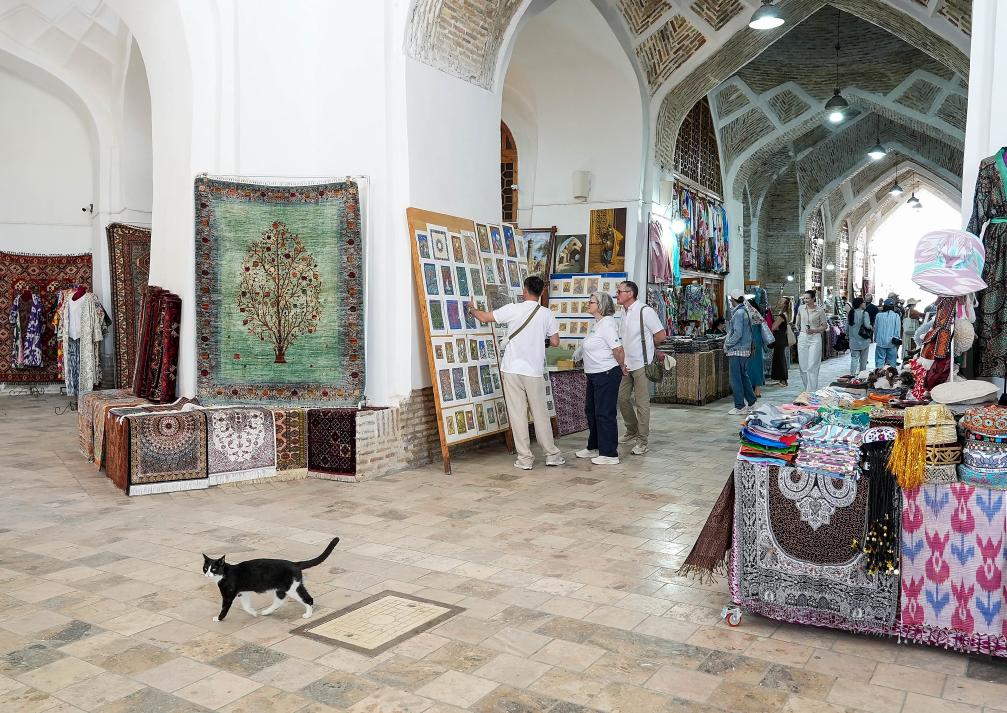 24日、ブハラのバザール内を歩く猫。(ブハラ=新華社配信)