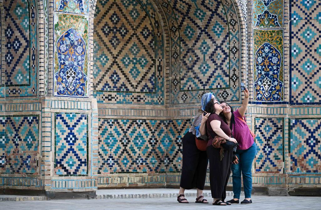 24日、ブハラの街の一角で自撮りする観光客。(ブハラ=新華社記者/李任滋)