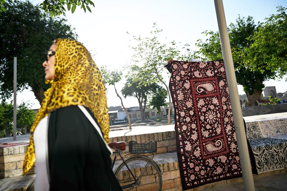 24日、ブハラの街を散策する女性。(ブハラ=新華社記者/李任滋)